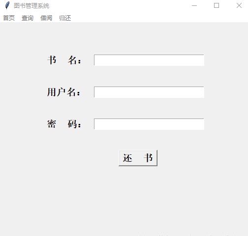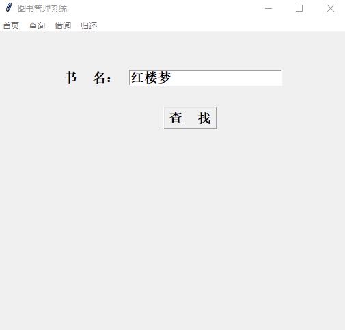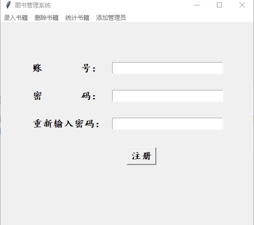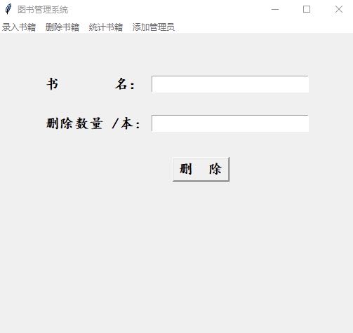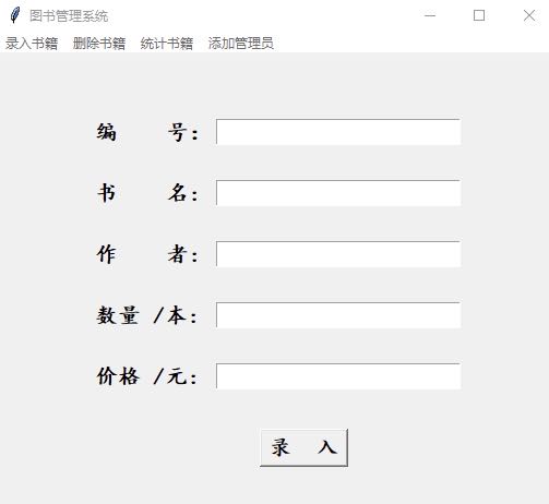 | **from** tkinter **import** \* **from** tkinter.messagebox **import** \* <br/>**class** AddFrame(Frame): **def** \__init_\_(self,master = **None**): Frame.\__init_\_(self, master) self.root = master _ _self.book_ID = StringVar() self.book_Name = StringVar() self.book_Writer = StringVar() self.book_Num = StringVar() self.book_Price = StringVar() self.createPage() <br/>**def** createPage(self): Label(self).grid(row = 0,stick = W,pady = 10) Label(self, text = **'编 号:'**,font = (**"楷体"**,15,**"bold"**)).grid(row = 1,stick = W,pady = 15) Entry(self,textvariable=self.book_ID,font = (**"楷体"**,15,**"bold"**)).grid(row = 1,column = 1,stick = E) Label(self, text = **'书 名: '**,font = (**"楷体"**,15,**"bold"**)).grid(row=2, stick=W, pady=15) Entry(self, textvariable=self.book_Name,font = (**"楷体"**,15,**"bold"**)).grid(row=2, column=1, stick=E) Label(self, text = **'作 者: '**,font = (**"楷体"**,15,**"bold"**)).grid(row=3, stick=W, pady=15) Entry(self, textvariable=self.book_Writer,font = (**"楷体"**,15,**"bold"**)).grid(row=3, column=1, stick=E) Label(self, text = **'数量 /本: '**,font = (**"楷体"**,15,**"bold"**)).grid(row=4, stick=W, pady=15) Entry(self, textvariable=self.book_Num,font = (**"楷体"**,15,**"bold"**)).grid(row=4, column=1, stick=E) Label(self, text = **'价格 /元: '**,font = (**"楷体"**,15,**"bold"**)).grid(row=5, stick=W, pady=15) Entry(self, textvariable=self.book_Price,font = (**"楷体"**,15,**"bold"**)).grid(row=5, column=1, stick=E) Button(self, text=**'录 入'**,font = (**"楷体"**,15,**"bold"**),command = self.add_books).grid(row = 6,stick=W,column=1, pady=20,padx = 40) <br/>**def** add_books(self): bookid = self.book_ID.get() bookname = self.book_Name.get() bookwriter = self.book_Writer.get() booknum = self.book_Num.get() bookprice = self.book_Price.get() f = open(**'books.txt'**) temp = 0 **for** line **in** f: l = line.strip().split(**','**) **if** l\[1\] == bookname: temp = 1 **break else**: **continue if** temp == 1:_ _**with** open(**'books.txt'**,**'r'**) **as** fr: lines = fr.readlines() **with** open(**'books.txt'**,**'w'**) **as** fw: **for** line **in** lines: v = line.strip().split(**','**) **if** bookname == v\[1\]: num = int(booknum)+int(v\[3\]) num_str = str(num) fw.write(v\[0\]+**','**+v\[1\]+**','**+v\[2\]+**','**+num_str+**','**+v\[4\]+**'\\n'**) **else**: fw.write(line) fr.close() fw.close() **else**:_ _fw = open(**'books.txt'**,**'a'**) fw.write(bookid+**','**+bookname+**','**+bookwriter+**','**+booknum+**','**+bookprice+**'\\n'**) fw.close() showinfo(message=**'录入成功!'**) <br/>**class** DeleteFrame(Frame): **def** \__init_\_(self,master = **None**): Frame.\__init_\_(self, master) self.root = master _ _self.book_Name = StringVar() self.booknum_Delete = StringVar() self.createPage() <br/>**def** createPage(self): Label(self).grid(row = 0,stick = W,pady = 10) Label(self, text = **'书 名:'**,font = (**"楷体"**,15,**"bold"**)).grid(row = 1,stick = W,pady = 15) Entry(self,textvariable=self.book_Name,font = (**"楷体"**,15,**"bold"**)).grid(row = 1,column = 1,stick = E) Label(self, text = **'删除数量 /本: '**,font = (**"楷体"**,15,**"bold"**)).grid(row=2, stick=W, pady=15) Entry(self, textvariable=self.booknum_Delete,font = (**"楷体"**,15,**"bold"**)).grid(row=2, column=1, stick=E) Button(self, text=**'删 除'**,font = (**"楷体"**,15,**"bold"**),command = self.delete_books).grid(row = 6,stick=W,column=1, pady=20,padx = 30) <br/>**def** delete_books(self): bookname = self.book_Name.get() book_num_delete = self.booknum_Delete.get() f = open(**'books.txt'**) temp = 0 **for** line **in** f: l = line.strip().split(**','**) **if** bookname == l\[1\] **and** int(l\[3\]) > int(book_num_delete): _ _temp = 1 **break elif** bookname == l\[1\] **and** int(l\[3\]) <= int(book_num_delete):_ _temp = 2 **break else**: **continue if** temp == 1: **with** open(**'books.txt'**,**'r'**) **as** fr: lines = fr.readlines() **with** open(**'books.txt'**,**'w'**) **as** fw: **for** line **in** lines: v = line.strip().split(**','**) **if** bookname == v\[1\]: num = int(l\[3\]) - int(book_num_delete) str_value = str(num) fw.write(l\[0\]+**','**+l\[1\]+**','**+l\[2\]+**','**+str_value+**','**+l\[4\]+ **'\\n'**) **else**: fw.write(line) fr.close() fw.close() showinfo(message=**'删除成功!'**) **elif** temp == 2: **with** open(**'books.txt'**,**'r'**) **as** fr: lines = fr.readlines() **with** open(**'books.txt'**,**'w'**) **as** fw: **for** line **in** lines: v = line.strip().split(**','**) **if** bookname == v\[1\]: **continue **fw.write(line) fr.close() fw.close() showinfo(message=**'删除成功!'**) **else**: showwarning(title = **'Waring'**,message = **'您输入的图书书名有误,请重新输入!'**) <br/>**class** CountFrame(Frame): **def** \__init_\_(self,master = **None**): Frame.\__init_\_(self, master) self.root = master _ _self.book_Name = StringVar() self.createPage() <br/>**def** createPage(self): Label(self).grid(row = 0,stick = W,pady = 40) Label(self, text = **'书 名:'**,font = (**"楷体"**,15,**"bold"**)).grid(row = 1,stick = W,pady = 20) Entry(self,textvariable=self.book_Name,font = (**"楷体"**,15,**"bold"**)).grid(row = 1,column = 1,stick = E) Button(self, text=**'统 计'**,font = (**"楷体"**,15,**"bold"**),command = self.count_books).grid(row = 6,stick=W,column=1, pady=20,padx = 30) <br/>**def** count_books(self): bookname = self.book_Name.get() f = open(**'books.txt'**) **for** line **in** f: l = line.strip().split(**','**) **if** l\[1\] == bookname: count_remain = int(l\[3\]) **break else**: **continue **f1 = open(**'book_lend.txt'**) count_lend = 0 **for** line1 **in** f1: l1 = line1.strip().split(**','**) **if** l1\[0\] == bookname: count_lend += 1 _ _**else**: **continue **count_all = count_remain + count_lend countWin = Tk() countWin.title(**'统计信息'**) countWin.geometry(**'500x400'**) Label(countWin).grid(row = 0,stick = W,pady = 20) Label(countWin, text = **'书 名: '**+bookn